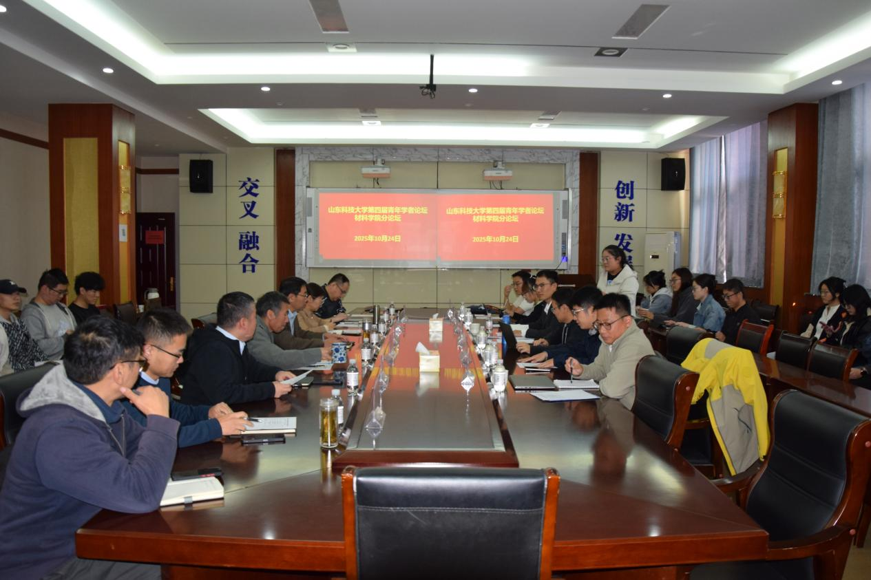 10 月 24 日下午,山东科技大学第四届“山海泉”青年学者泰山国际论坛暨“博聚青岛·筑梦山科”博士(后)论坛材料学院分论坛在J2-434 会议室顺利召开。材料学院党委书记申兆亮,副院长韩永芹、田健和部分教师学生代表参加论坛。本次论坛由材料学院副院长田健主持。
